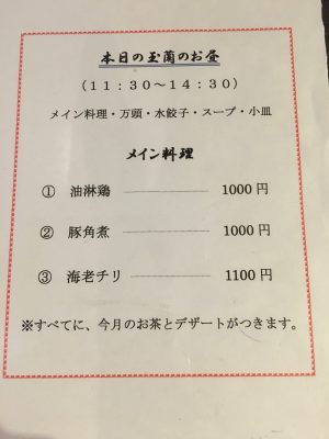 こちらがランチメニュー。メインを選ぶことができ、それに万頭、水餃子、スープ、小皿、お茶、デザートまでがついて1,000円もしくは1,100円とお得な内容です。