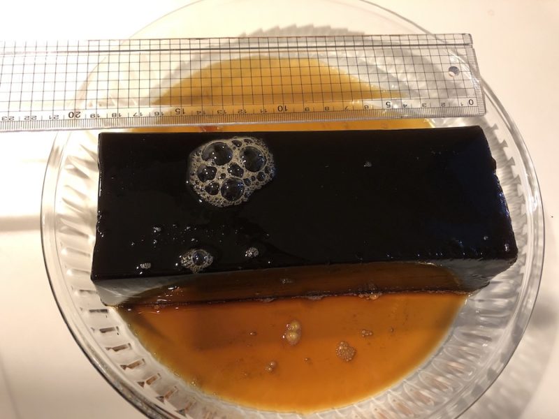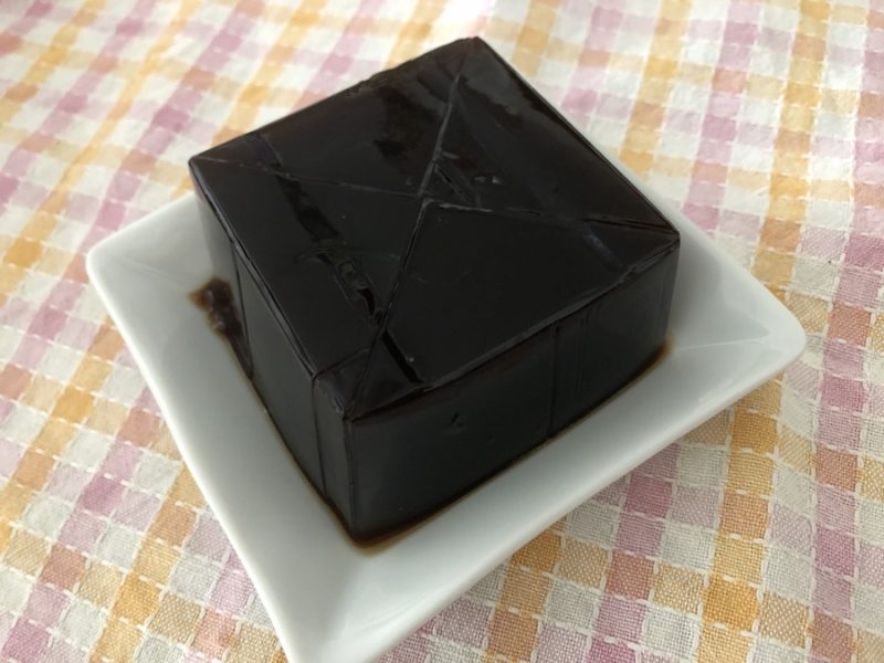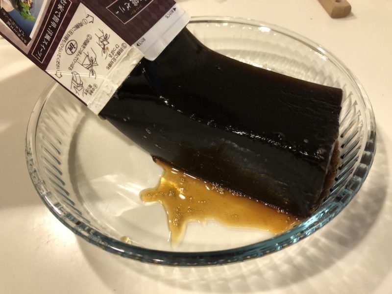 でろんと、液体ではなくゼリーの塊そのものが!!!(※羊羹にも見えますが、コーヒーゼリーです。)