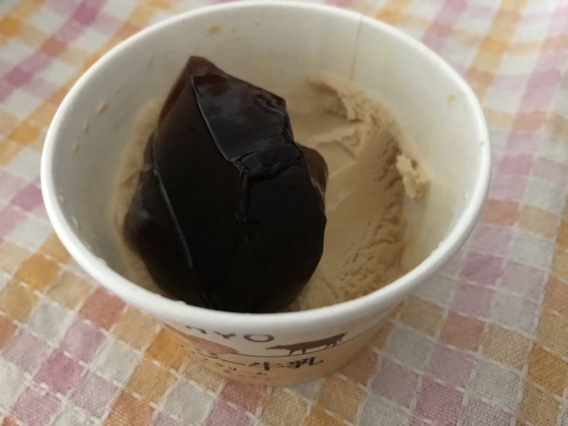 食べてみると、味はほんのり甘くあっさり。おそらく黒糖がゼリーの中に入っているからでしょう。ほろ苦なので、ちょっと甘くしてみたい!と、アレンジでアイスの上にドーンと乗せてみました。