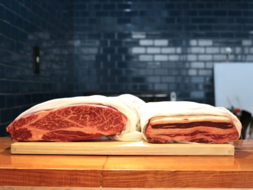 赤身の多いジャージー牛は本がえしという仕込み、サシが特徴の菊池源吾牛は生がえしという仕込みで作られています。ちなみに”かえし”とは簡単に言うと醤油みたいなものなんですって。