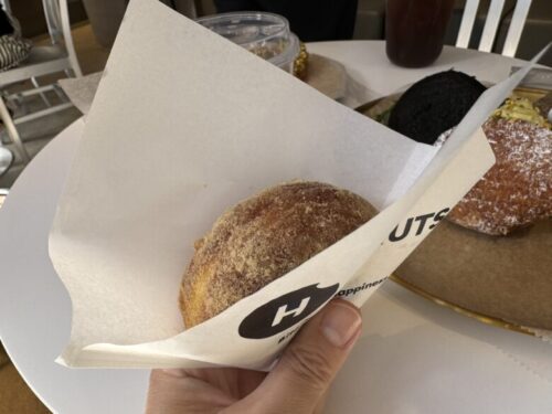 なんと30秒以内に食べなければならない!というのは大げさですが、そのくらいが一番美味しい、名物のH DONUTです。プレーン味となっており、揚げたてをいただきます。