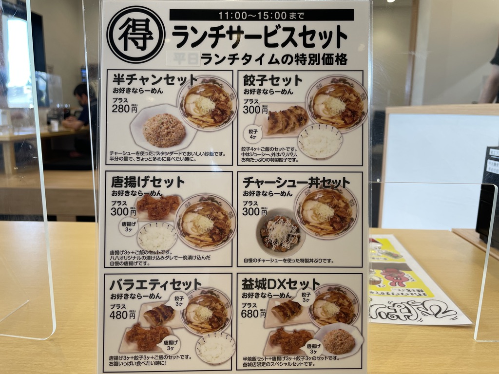 ランチメニューがこちら。益城限定メニューでしょうか?「益城DXセット」なんてものもあります。