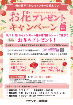 5月11日にイオンモール熊本専門店のお買い上げレシートを提示するとお花をもらえます。