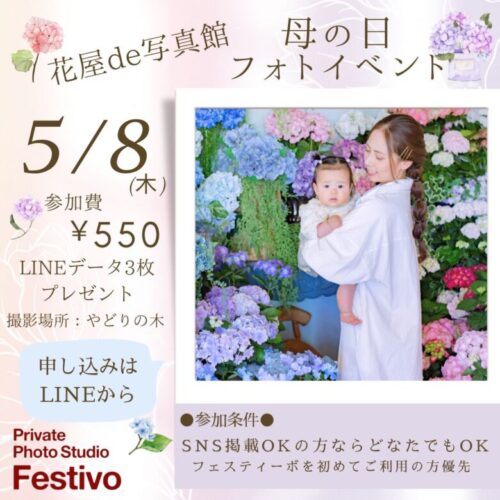 玉名にあるフォトスタジオ「フェスティーボ」では母の日のイベントとして550円でプロのカメラマンに撮影をしてもらえますよ。