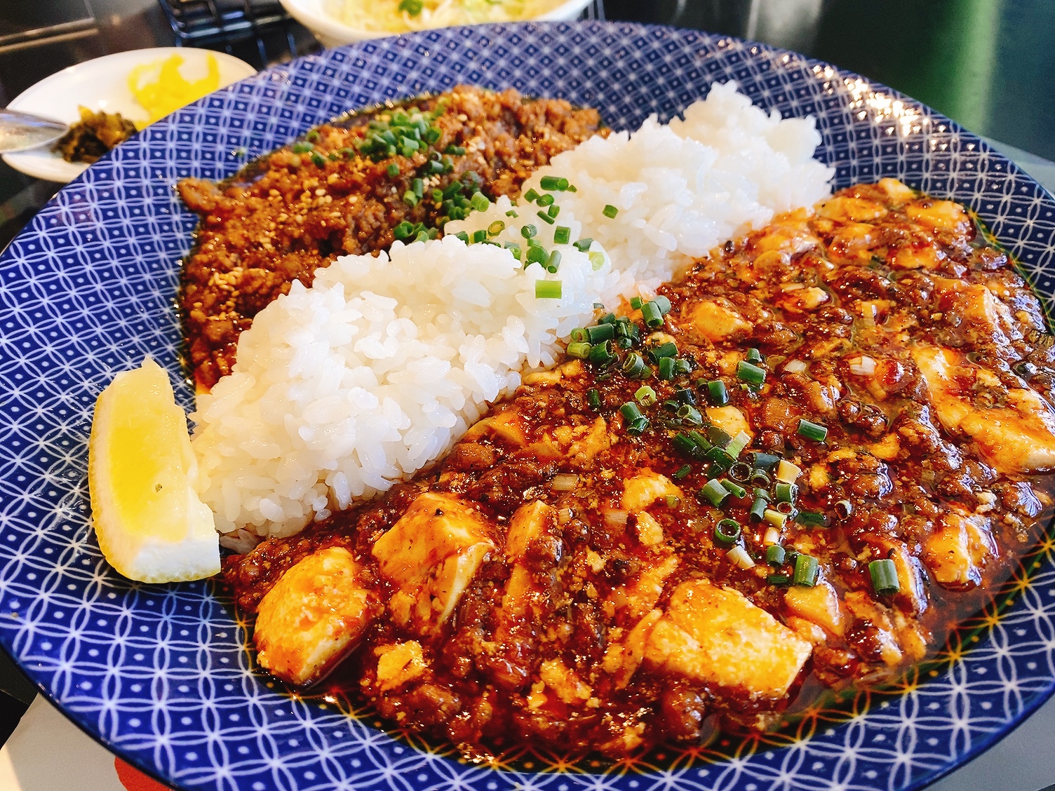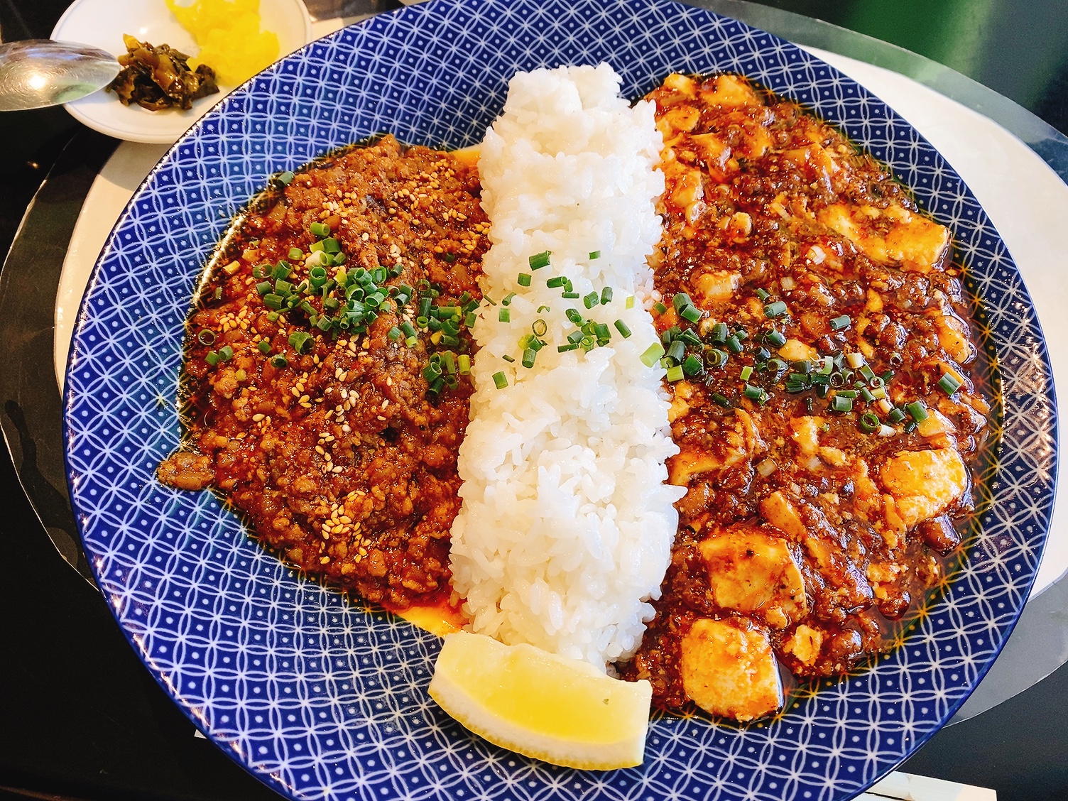 中華キーマカレーと龍の子式麻婆豆腐のあいがけを食べるのです…!