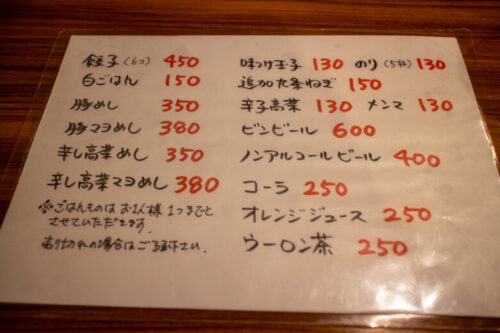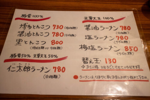 店名に博多ラーメンと付くだけあって、メニュー表には豚骨100%の博多ラーメンが先頭に書いてあります。