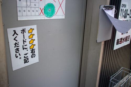 名簿は風でめくれてしまっていますが、入店する際にはなかった【右のボードにご記入ください】の張り紙と名簿がでていました。