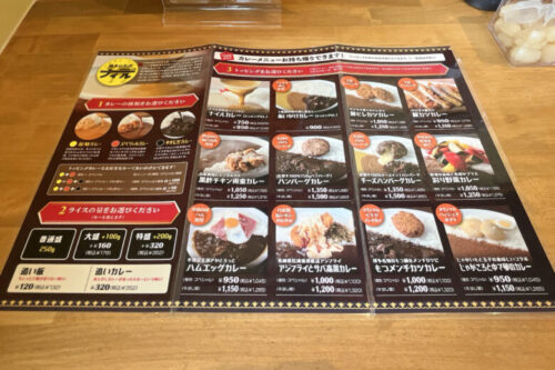 メニューはこちら。カレーは復刻カレー・スペシャルカレー・牛すじ黒カレーの3種類。