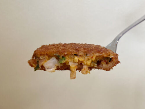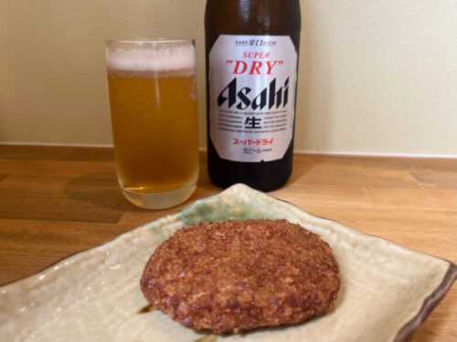 今回、ビールのお供には単品でも頼めるトッピングのもつメンチを。福岡名物のもつ鍋がメンチカツになっているそう。