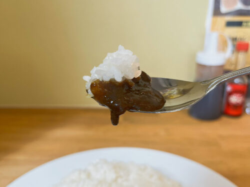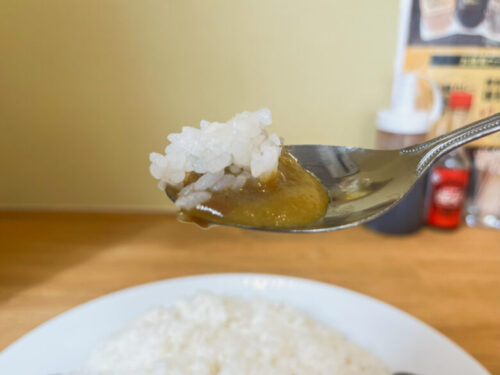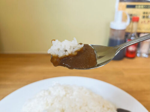 野菜とポークの形は残っておらずサラサラのルー。甘さの奥には複雑な旨味を感じます。
