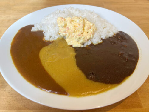 復刻カレー・スペシャルカレー・牛すじ黒カレーの3種類のカレーが掛かっています。3つともルーの色が全く異なるので、芸術のような3色の模様になったカレーがやってきます。