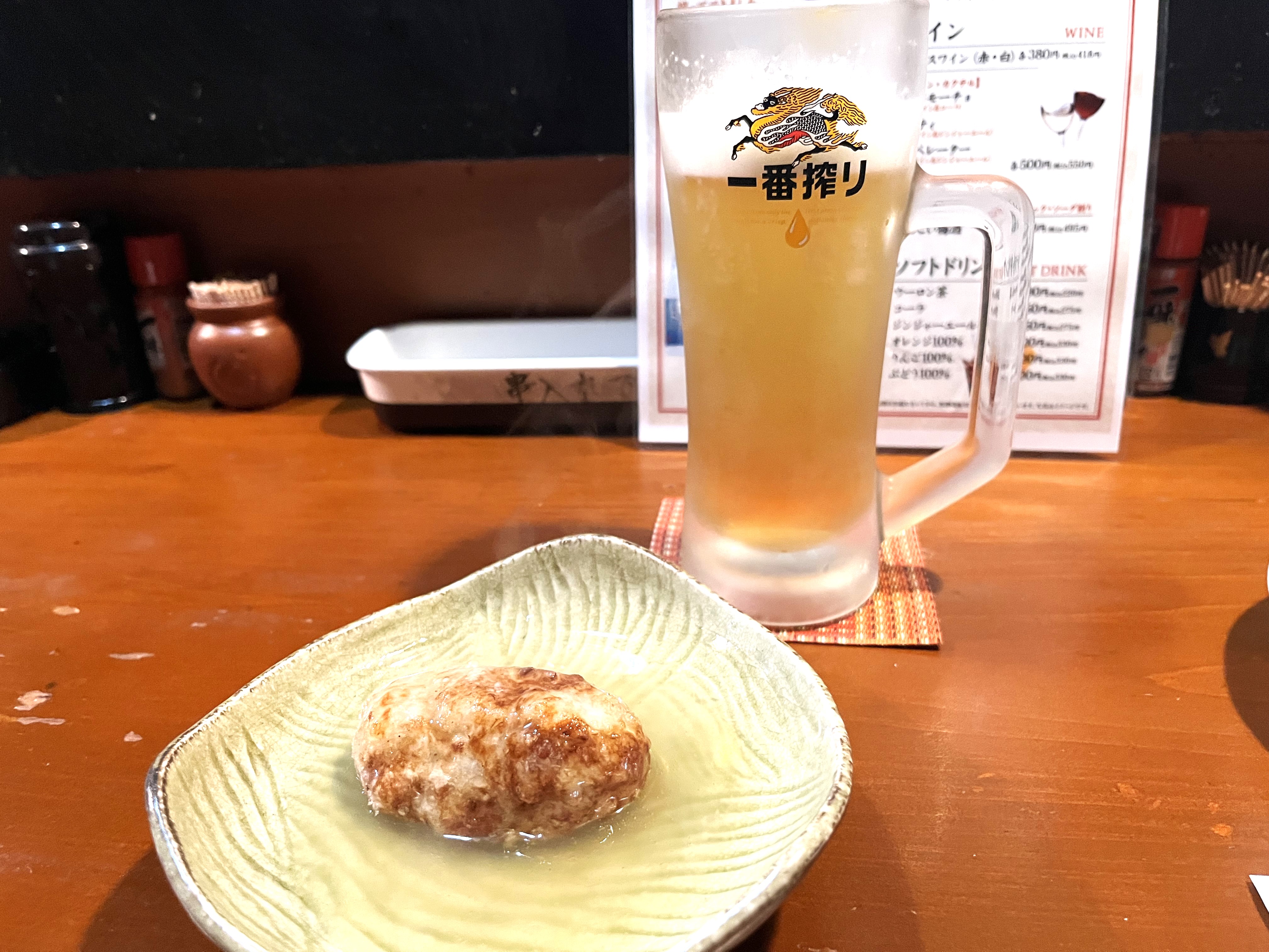 料理の注文を終えてしばし待ちます。お通しで出てきたのは里芋饅頭。里芋の中にはしっかり味付けされたそぼろ。丁寧に作られています。これがお通しなんていいんですか?と言いたいくらい。