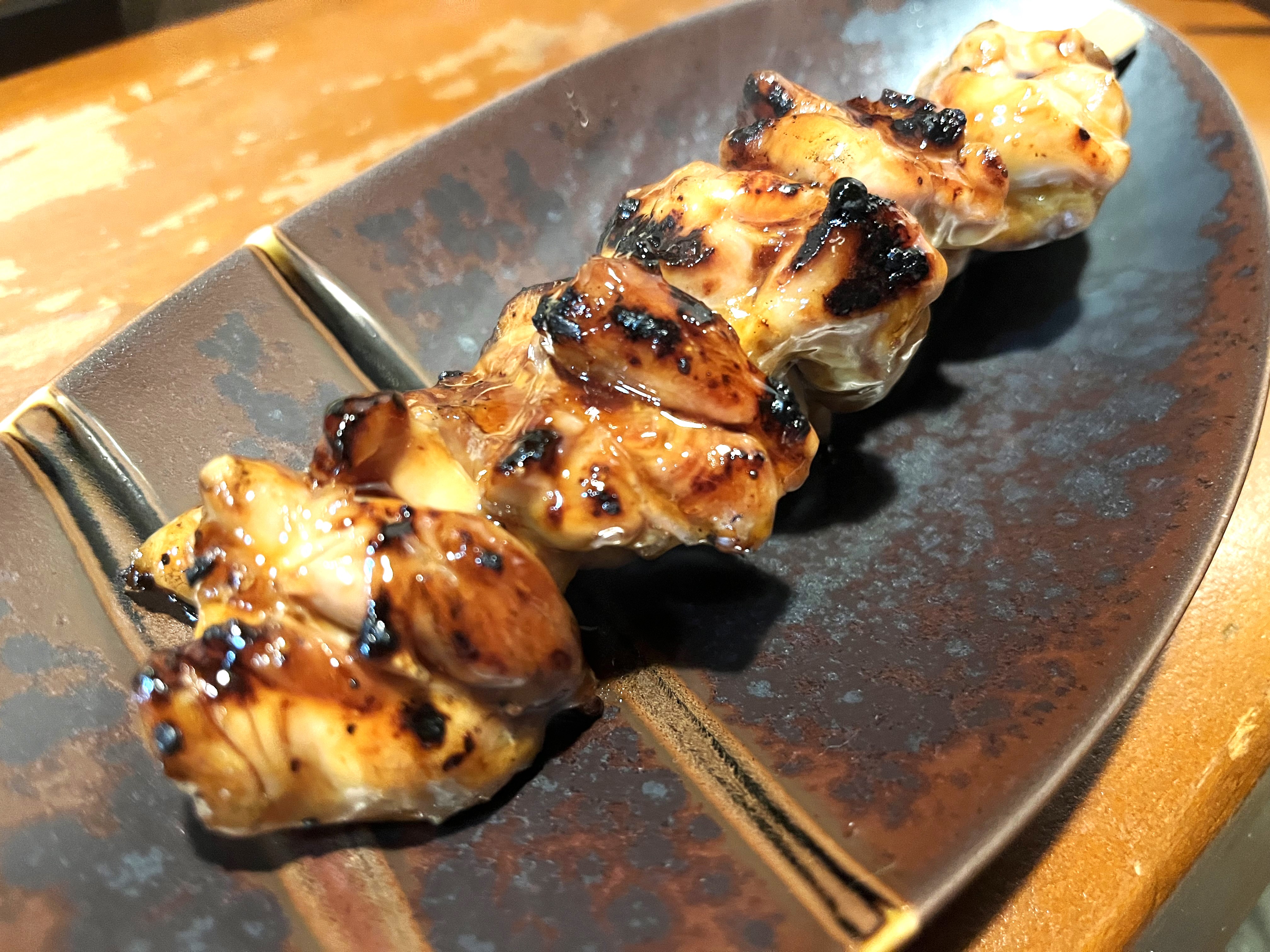 お次は名物という極太とりみ串。タレでテリッテリに焼かれたとりみ。