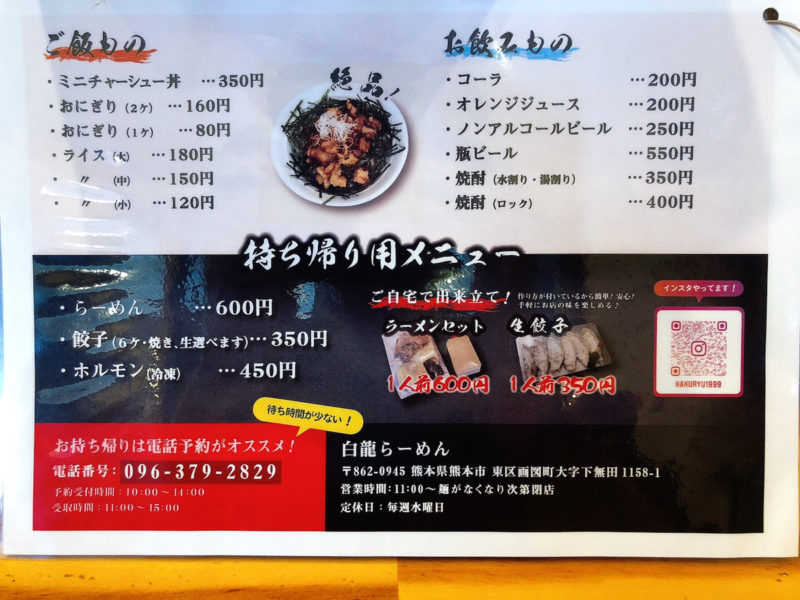 | 営業時間 | 月・火・木・金 11:00~15:00 土・日 11:00~14:30 17:30~20:00 麺が無くなり次第終了 |