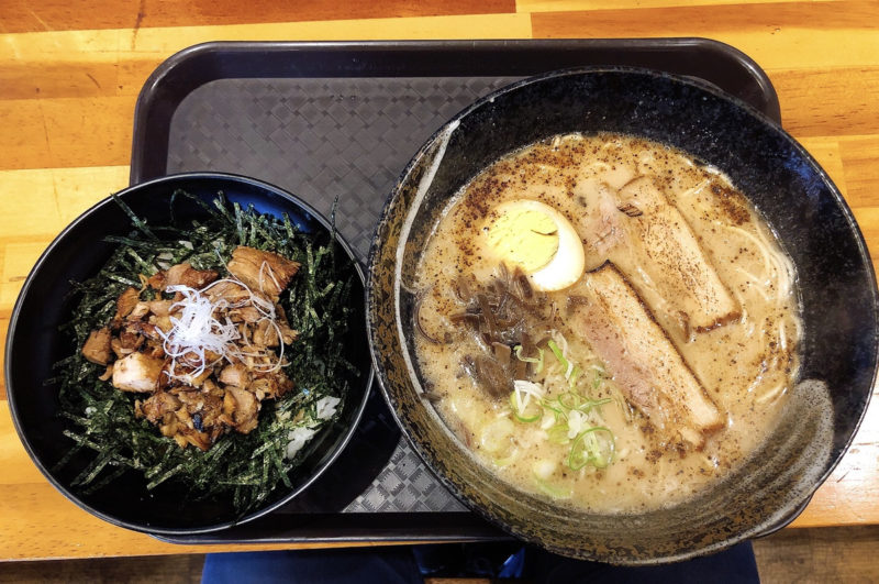来ました!らーめんチャーシュー丼セット。とんこつらーめんの香りってなんでこんなに多幸感を得られるんでしょうね。