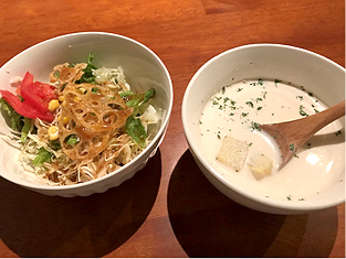 左が和風サラダ、右がさつまいもと豆乳のスープです。