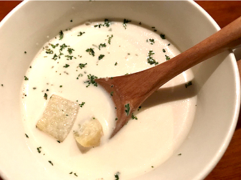 豆乳スープには、さつまいもがごろっと入っていて食べごたえがあります。味はあっさりしていて、とても食べやすい一品でした。