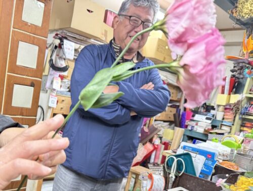 まず手始めに、いただいたトルコギキョウを荻原さんに渡してみました。