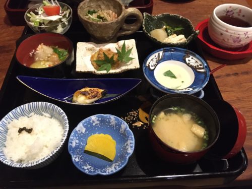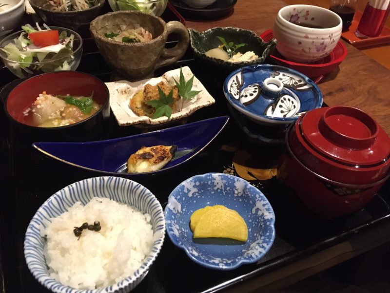 サラダや唐揚げ、煮物に焼き物など、野菜もお肉もお魚も楽しめる、贅沢な御膳です。