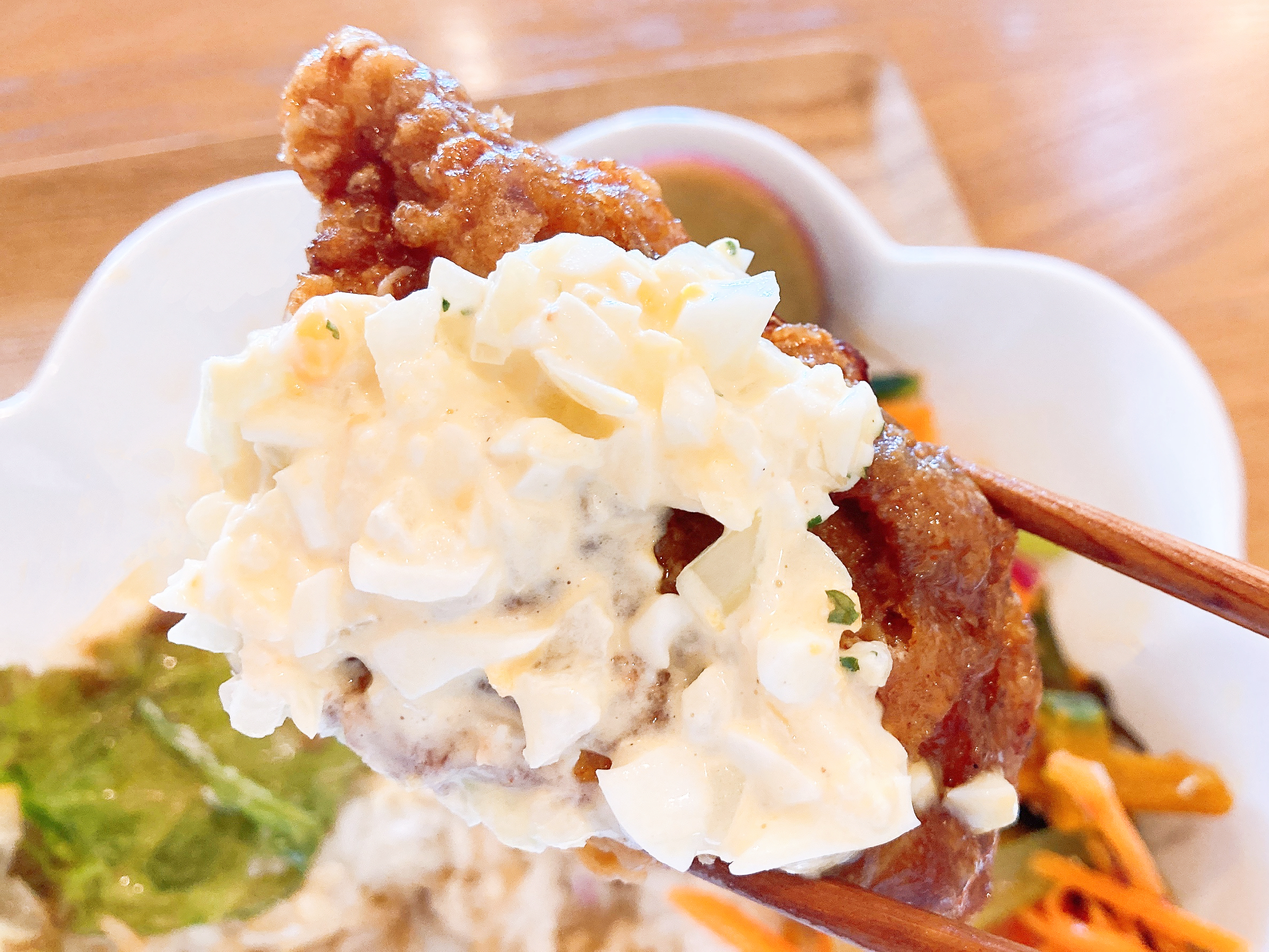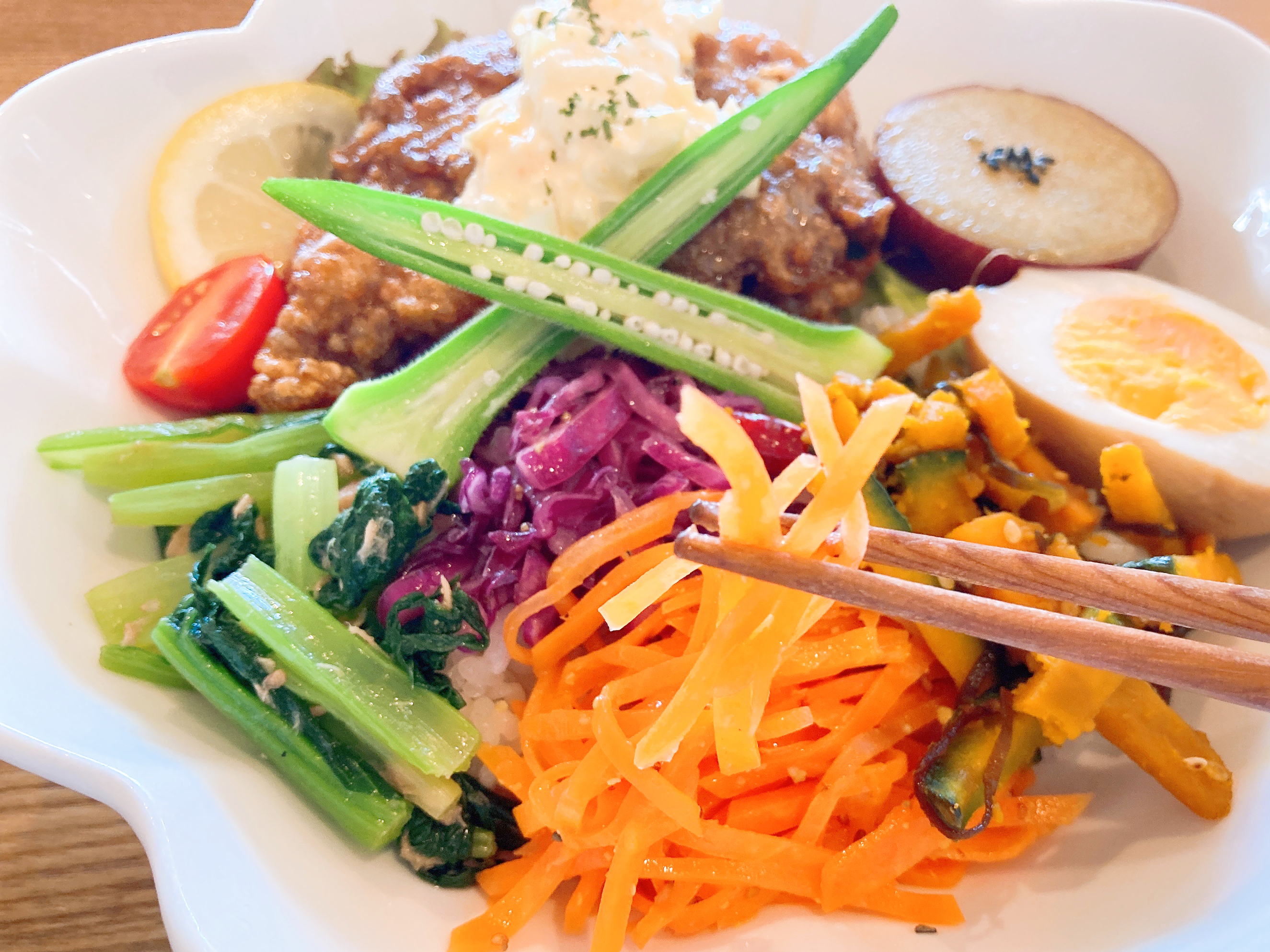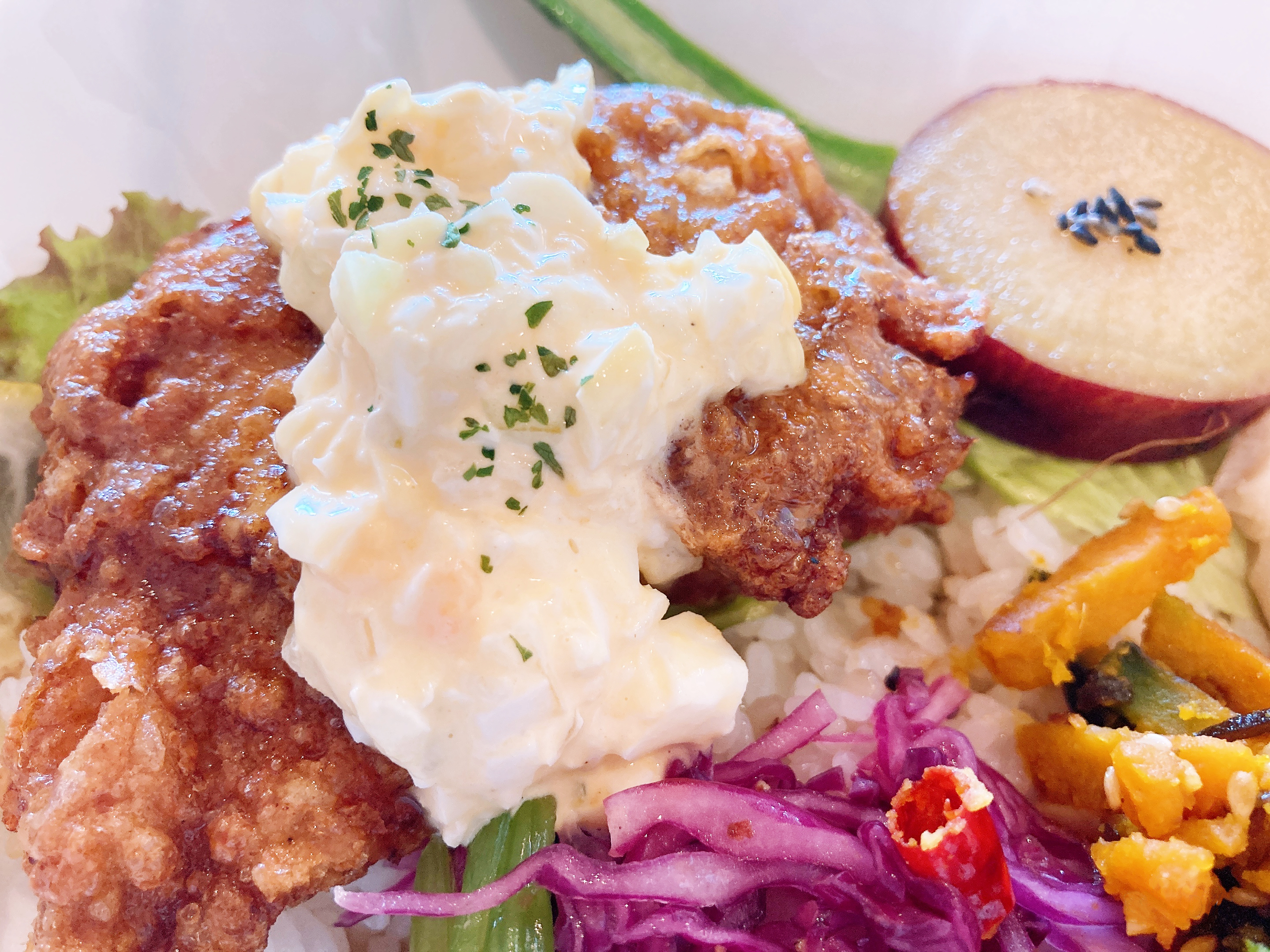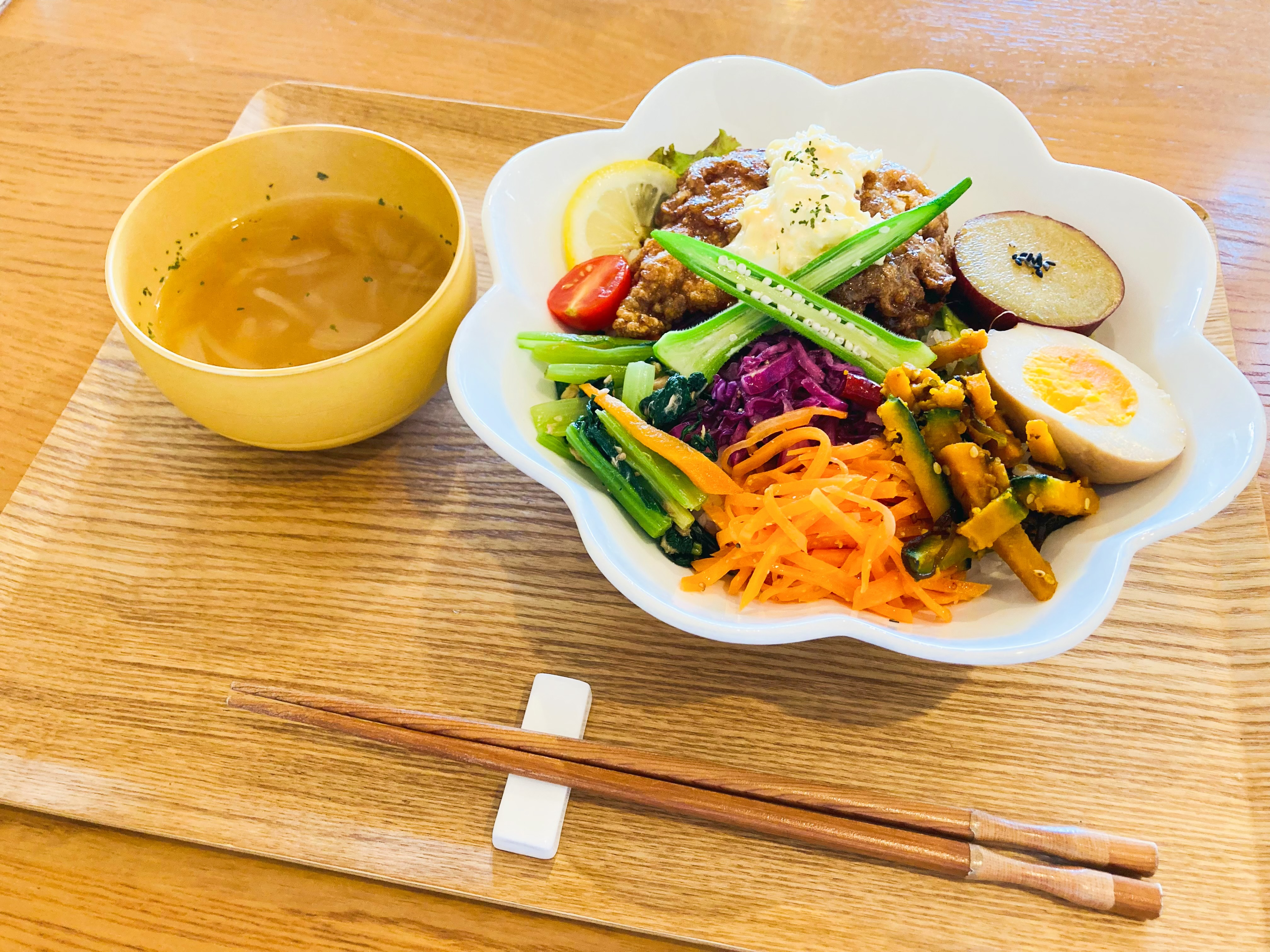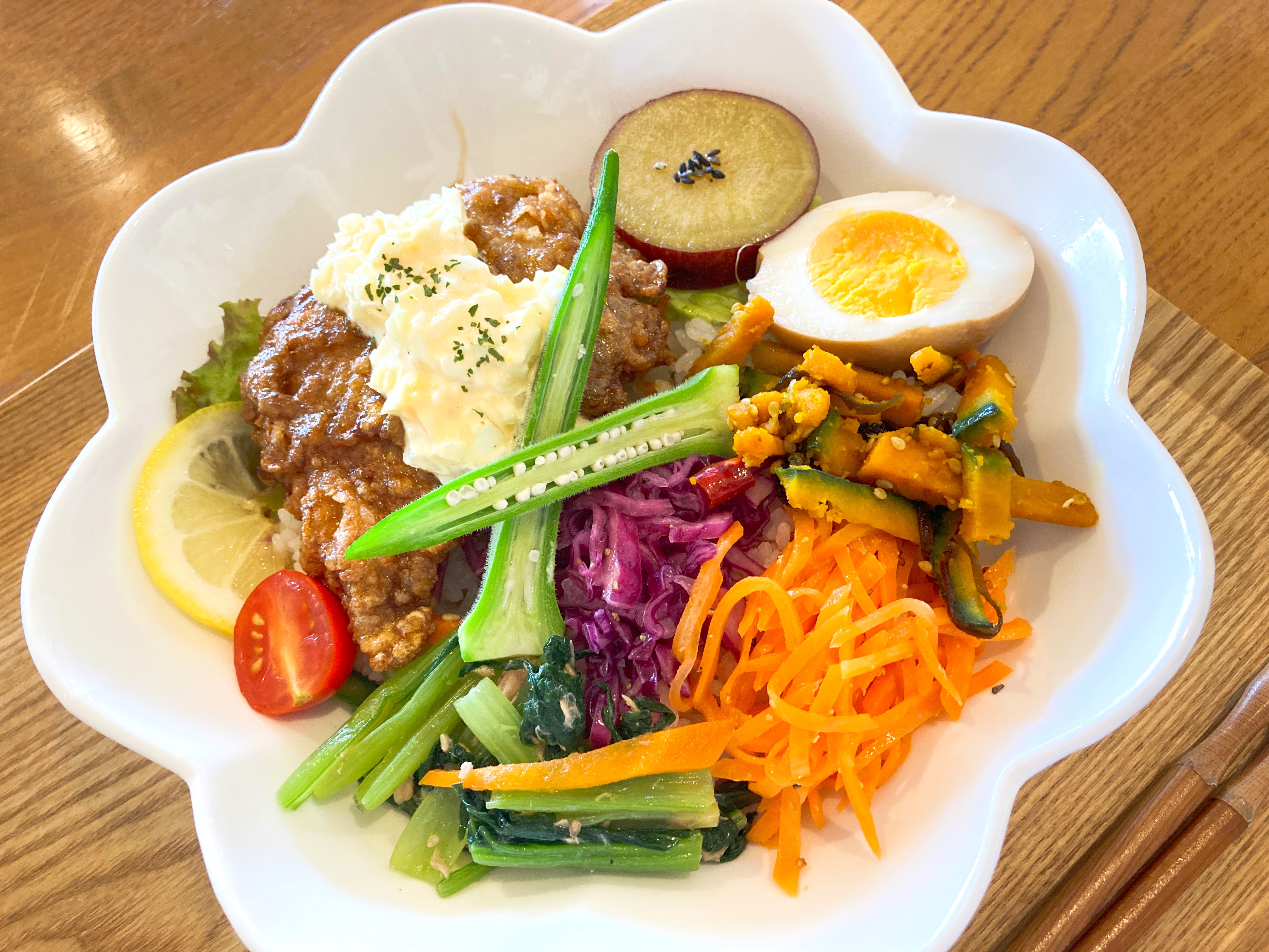 今回私が頂いた彩り野菜とチキン南蛮どんはがっつりチキン南蛮が乗っていますが、野菜もたっぷりなので罪悪感のない素敵すぎるメニュー。映えるのでテンションも爆上がりです。