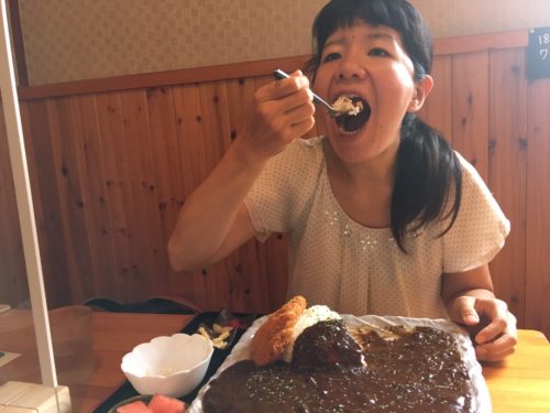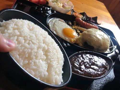 スペシャルハンバーグは、300gの巨大ハンバーグにチーズに目玉焼き、カレーまでついて、そして、このご飯の量!!!