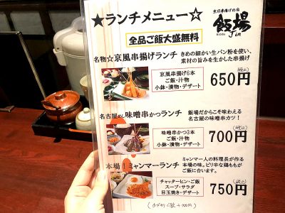 ランチメニューは京風串揚げランチ650円(税込)と、味噌串かつランチ700円(税込)、ミャンマーランチ750円(税込)の3種類。