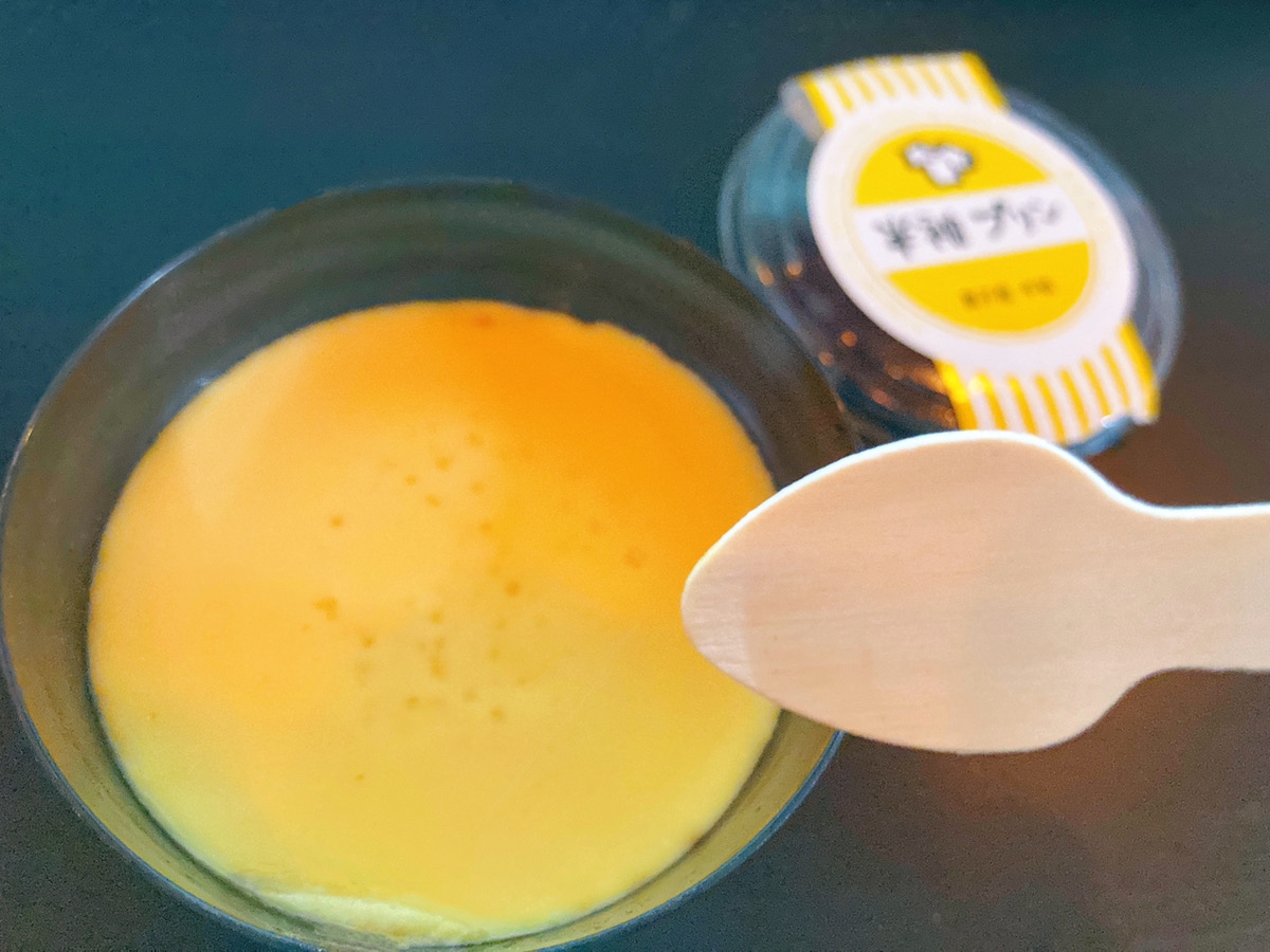「卵にこだわっています。添加物を使わず、平飼いで育てられた親鶏から生まれたブランド卵です。山吹色の薄い黄色をした黄身なので分かりづらいかもしれませんが、このプリンは一般的なプリンよりもたっぷり卵を使っているんですよ。」