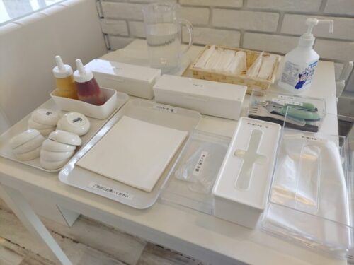 また、入口右側には、ハンバーガーを食べる時に使用するスプーンやフォーク、紙袋や手袋まで揃えてあります。専門店のハンバーガーはボリュームがあって食べにくいと感じる時もありますが、これだけ揃っていれば、食べにくさも気になりませんね!