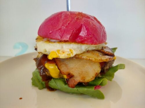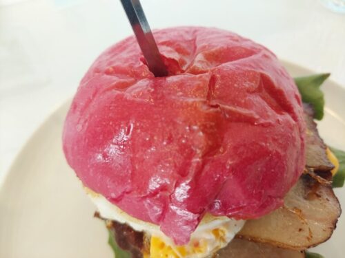 こちらが紫、ビーツで着色されたバンズ。種類はハピネスバーガーを注文しました。
