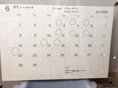 6月の営業カレンダーが貼られていました。お店のInstagramまたはTwitterにも営業予定が出ているので、事前にチェックしてから行くのがおすすめです。お店には電話もないので要注意です。