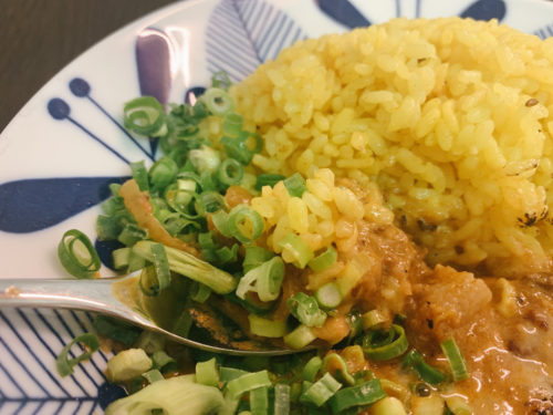 カレーライスに青ねぎという取り合わせは珍しく感じるけれど、意外なほど違和感なくまとまっています。カレーに青ねぎ、ありです。