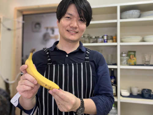 こちらがマスターの出来田(できた)智史さん。カメラを向けたら全力でバナナ持ってくれました。何だかバナナにピントが合っていてすみません。