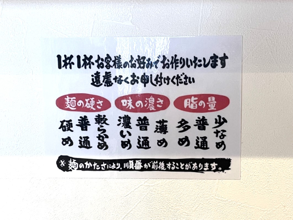 ラーメンは注文時に麺の硬さ・味の濃さ・脂の量を選べます。今回は全て普通です!
