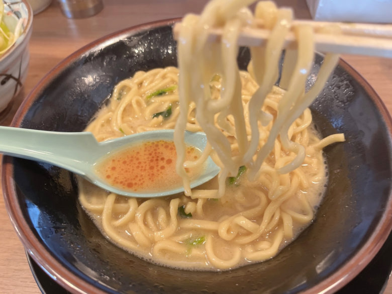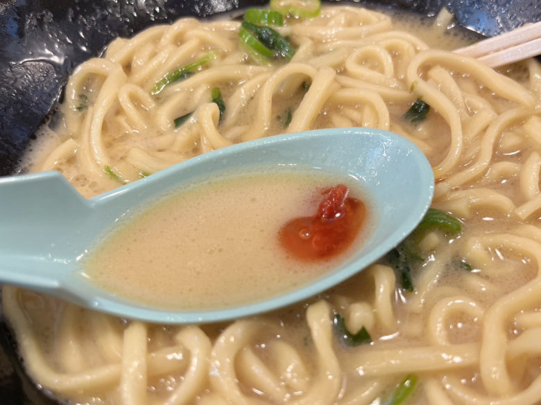 まずはスープから。スッキリとした豚骨に醤油のコクを強く感じます。