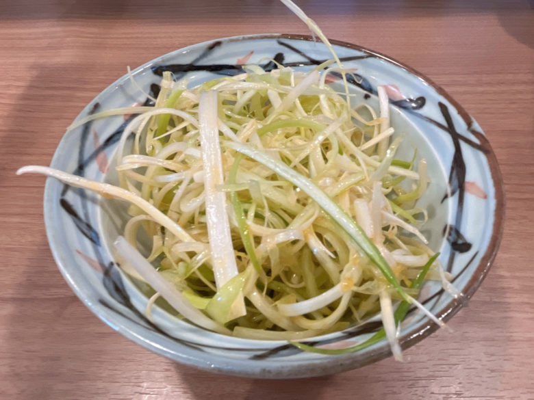 定番ラーメンを味わったら、次はトッピングで味変。別皿で頼んでいた白髪ネギをラーメンへ。