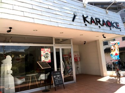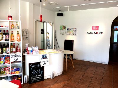白を基調としたスタイリッシュなカラオケ店です!お店のロゴも現代風に決まっていますね。