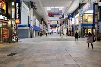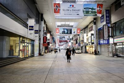 人もまばらな、朝の下通り。電車通り側からアーケードに入り、直進します。