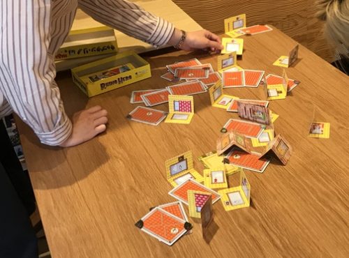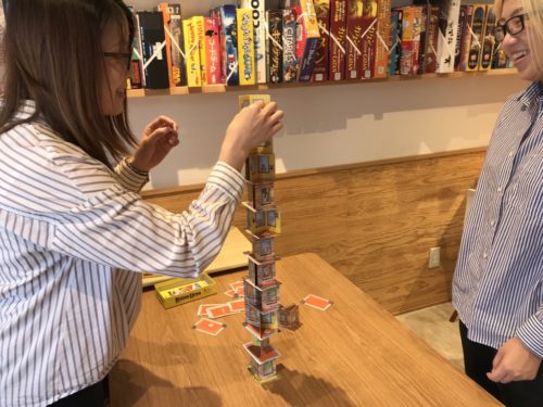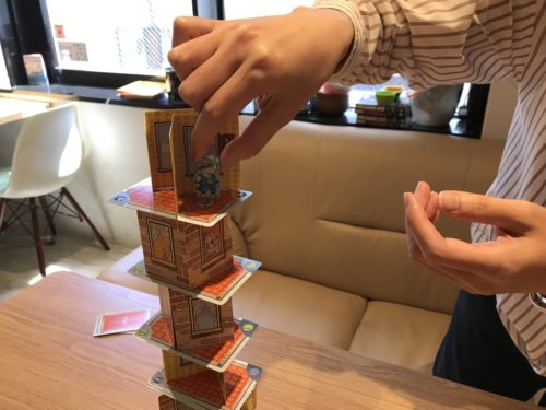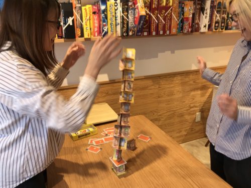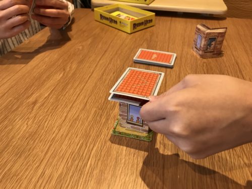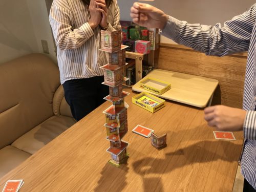 手札がなくなる前に積み上げたビルが倒れてしまったら、手元のカードが少ない人の勝ちです。