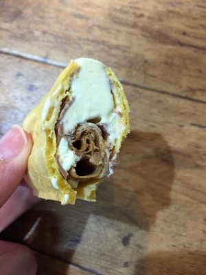 モナカを開けると、このような状態に。はがれてしまっていますがモナカの下にココアクリームが挟まっていますので、ルマンドの味がバニラで薄くなることはありませんでした。