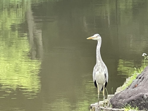 池のほとりにはアオサギの姿も。あまりに動かないのでロボかなと思って近づくと、ふわっと飛び立っていきました。