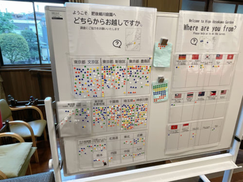 どこから来たのか、該当箇所に丸いシールを貼っていく仕組みです。