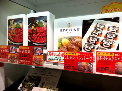 馬刺しやハンバーグなどの冷蔵・冷凍物も多くの品揃えが!くまモンハンバーグのパッケージが可愛いですね!