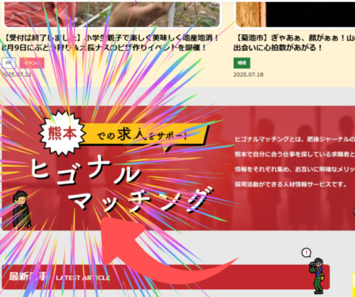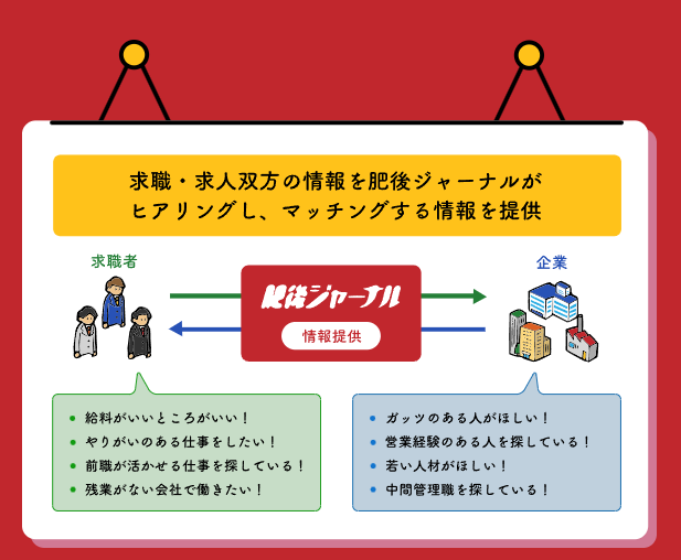 ヒゴナルマッチングとは、肥後ジャーナルの媒体を活かして、熊本で自分に合う仕事を探している求職者と求人活動をしている企業の情報をそれぞれ集め、お互いに明確なメリットがあるお仕事探しができる人材情報サービスです。