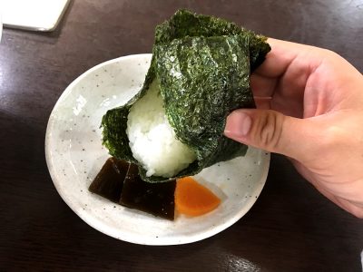 一緒に頼んだ「おにぎり」は1個100円と安い! 大きめのおむすびに漬物まで付いています。