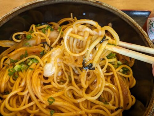 手延べ麺のナポリタン。ナポリタン好きの私としてはすごく気になる、絶対外せないメニューなのです。