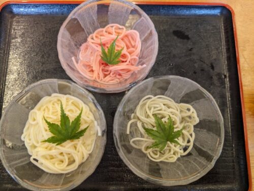 上から時計回りにとまとそうめん、紫蘇そうめん、柚子そうめん。