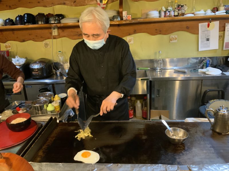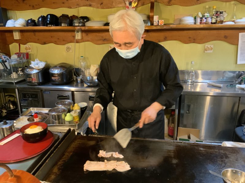 まずはキャベツと目玉焼きが焼かれるのを待ちます。豚肉はまだなのにもうワクワクが止まらない。