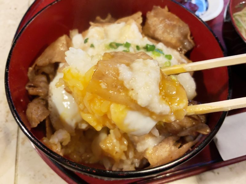 そして、たまごぷちゅん。とろーりと黄身がこぼれだして、とろろと豚肉、そしてご飯にしたたっていきます。