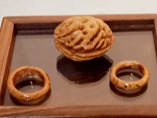 桃の種についた繊維を丁寧に取り除いて乾かし、磨いて削って出来上がるリングは手触りも滑らかです。