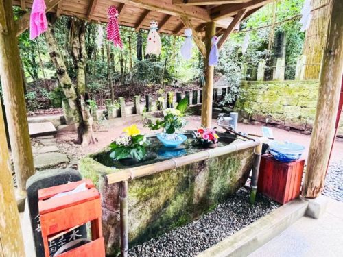 彦嶽宮では、花手水を実施されています。色とりどりの花が飾られていて鮮やかです。今は梅雨の時期なので、てるてる坊主もありました。てるてる坊主もカラフルで可愛いですね。